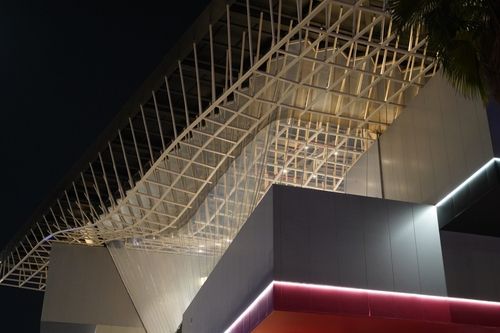 Im August 2021 konnte die ETFE-Fassade für den deutschen Pavillon auf der EXPO 2020 in Dubai mit einer Pandemie bedingten Verzögerung von einem Jahr nun endlich erfolgreich fertiggestellt werden. AR-Ingenieure verantwortete die Planung der Stahlbauteile für die Randanbindung der Membrane an das Gebäude, sowie die Werkstattplanung der Firma ITF für die Stahlseile und die ETFE-Folie der Fassade. Die 100 ca. 70 cm breiten Felder mit einer maximalen Länge von 10m falten sich im Zick-Zack über drei Himmelsrichtungen entlang der Fassadenebene um das Gebäude. Dabei fließt die Fassade mit ihrer halben Höhe und teilweise vollständig durch das abgehängte Vektorgrid – ein an Stahlrohren abgehängter Deckenrahmen, der sich wellenartig durch den Pavillon zieht. Erschwerend erfolgte die Montage zwischen den bereits montierten Elementen. Die variierende Geometrie der Fassade konnte effektiv mit Hilfe eines vollständig parametrisierten 3D-Modells abgebildet und in das BIM-Modell der Gesamtplanung integriert werden. Das Modell diente ebenfalls als Grundlage für die Ableitung der Fertigungsunterlagen. Mit einem Sondervorschlag für ein einheitliches Fußpunktdetail konnten die frei variierenden Seilabgangswinkel aus der Vertikalen bis zu 29° Grad technisch einfach gelöst werden. Aufgrund des temporären Charakters wurde auf den Einsatz von Verbundwerkstoffen verzichtet und bewusst handelsübliche Bauteile und Verbindungsmittel eingesetzt, die nach dem planmäßig erfolgten Rückbau des Pavillons einer wiederholten Nutzung zugeführt werden können.